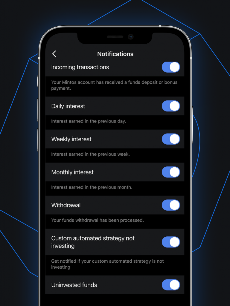 - Interest notifications give you alerts for daily, weekly, and monthly interest received, allowing you to track your earnings and monitor your investment’s performance.