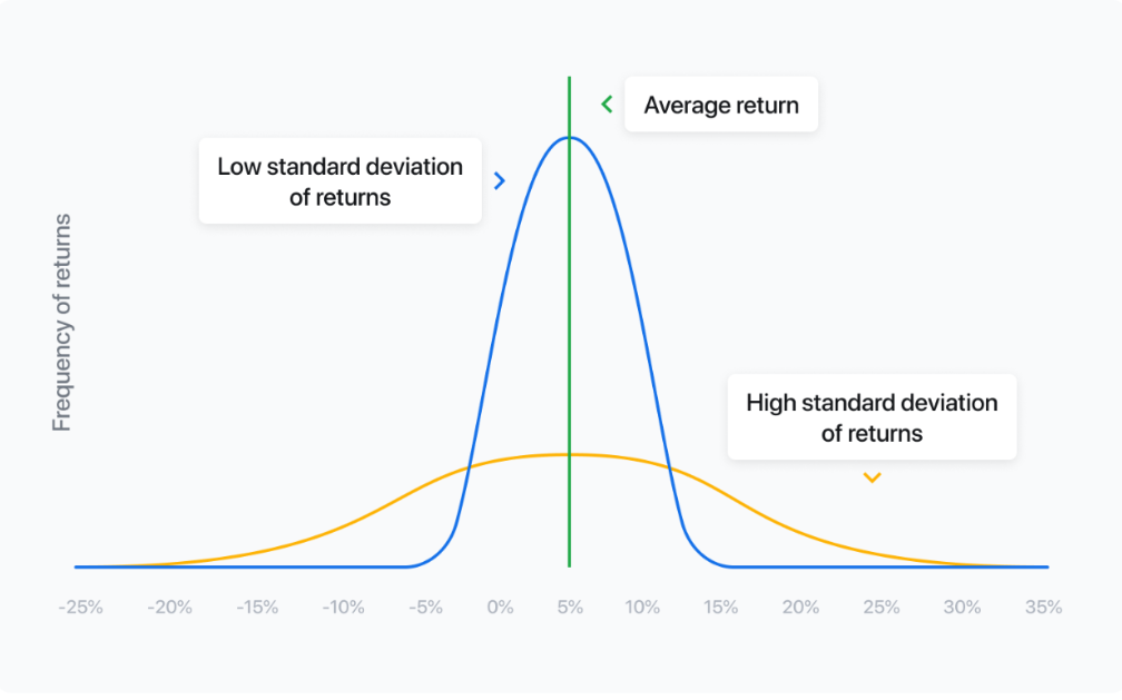 If the price of an investment is known to change unexpectedly and often, it would be considered volatile and have a high standard deviation. When the standard deviation is high, it’s more likely that an investment’s actual return will not be as expected.